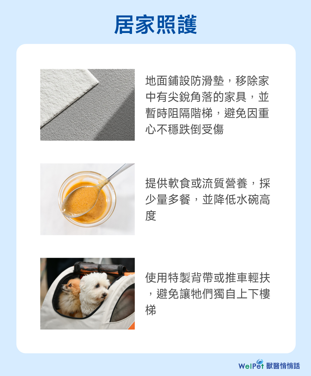 - 安全環境: 在地面鋪設防滑墊,移除家中有尖銳角落的家具,並暫時阻隔階梯,避免狗狗因重心不穩跌倒受傷。